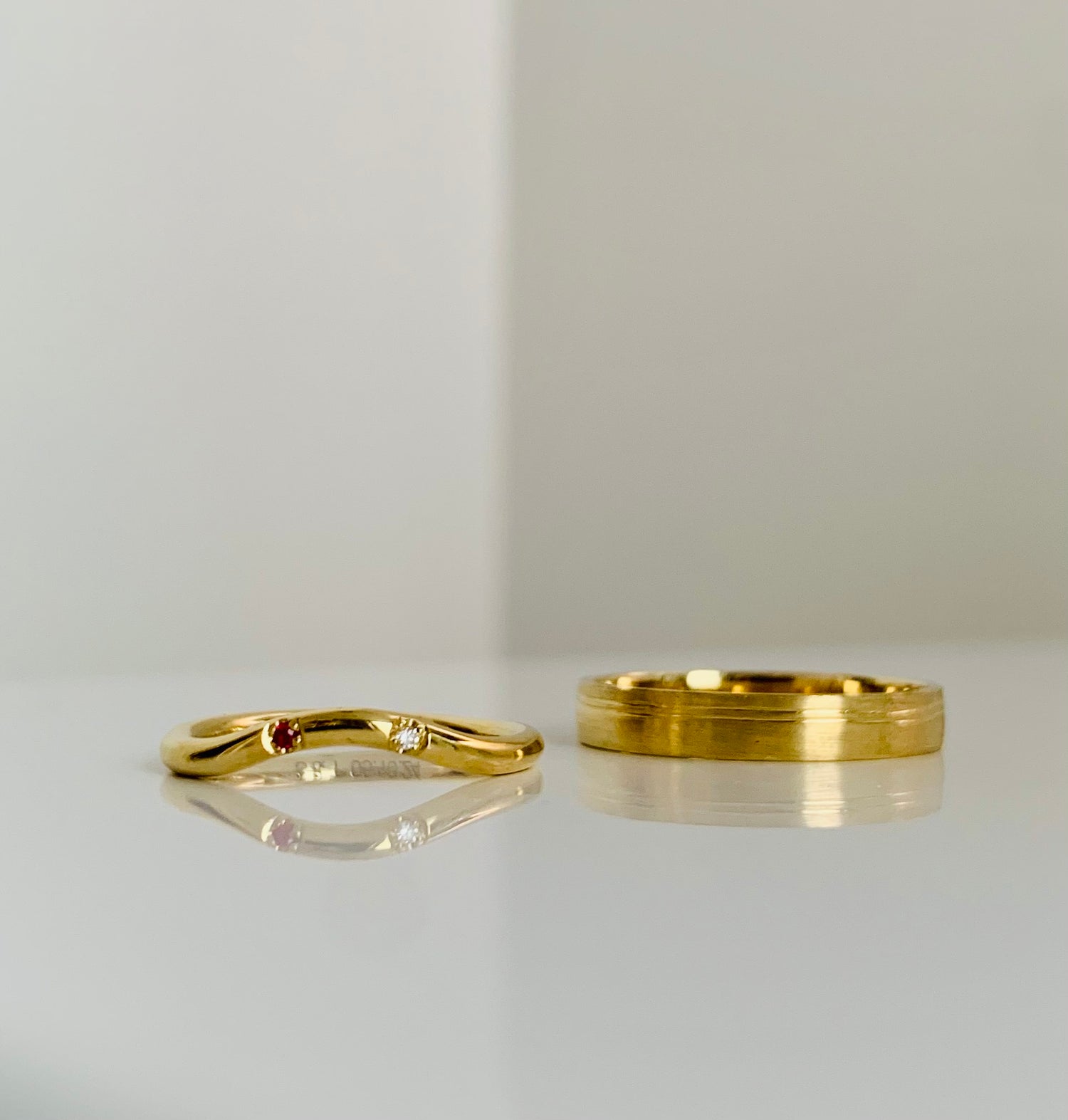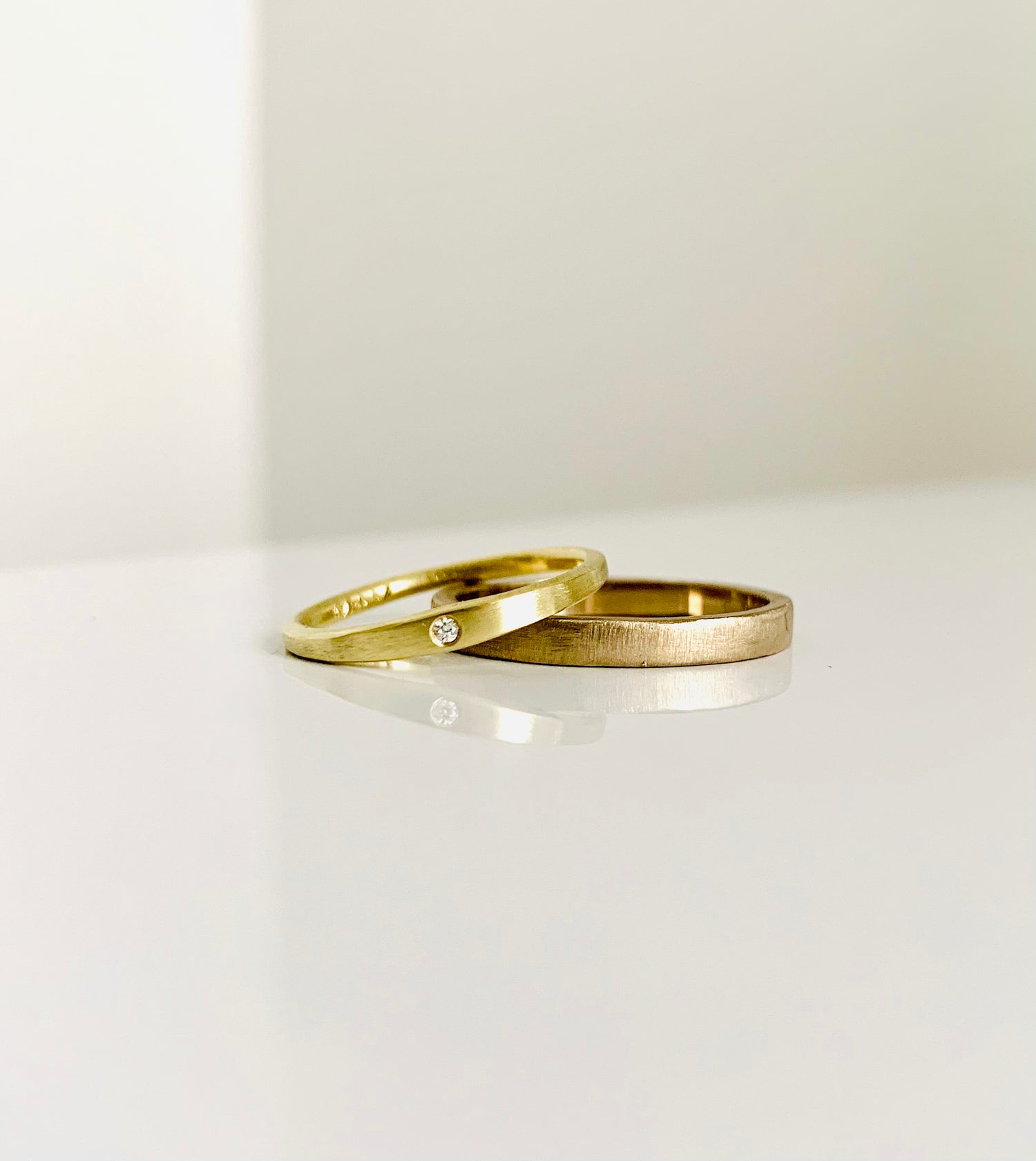 two rings, the same but different. One is a lighter yellow (14k) the other is a deeper yellow (18k)