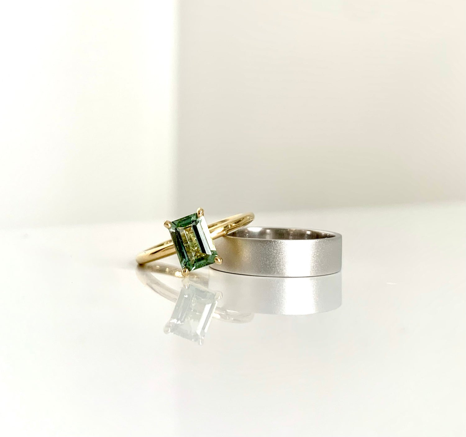 Hers: The classic Emerald ring. This version a 18k yellow gold ring, set with an 1,180ct green tourmaline 7x5mm.