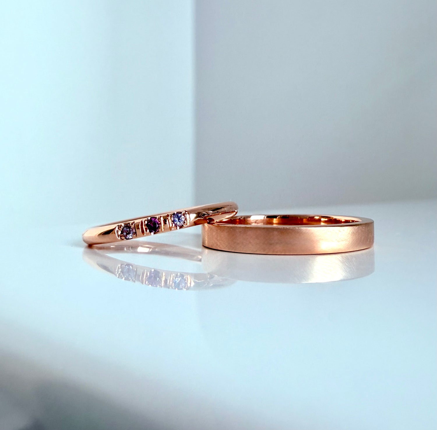 Hers: 2mm wide round ringband with 3 1,5mm stones in a castle setting, 1 Tanzanite & 2 Amethysts
